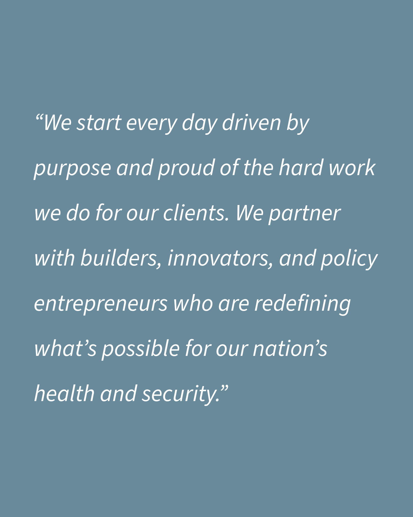 “Trust is the foundation of everything we do. We build enduring relationships with clients and government leaders alike, partnering with a select group who share our values. By bringing order to complexity, we help turn bold ambitions into meaningful partnerships and results.”